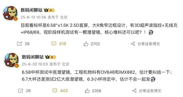 @数码闲聊站称,荣耀Magic 8系列已确定有标准版和Pro版两款机型,小屏旗舰仍在评估,就算有,也不会一起发布。Magic 8系列标准版搭载6.58英寸屏幕,采用大R角窄边框设计,拥有3D超声波指纹、无线充IP68/IP69防水,正在测试中底潜望镜,大杯搭载6.7英寸屏幕,正在测试2亿像素大底潜望镜。