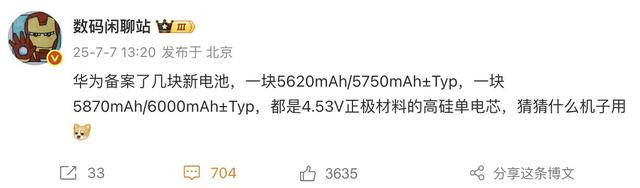 @数码闲聊站曝光了华为备案的两块电池,均为4.53V正极材料高硅单电芯,一块典型容量为5750mAh±,另一块典型容量为6000mAh。考虑到这两块电池单电芯的特性,搭载它们的机型很可能就是Mate 80系列。